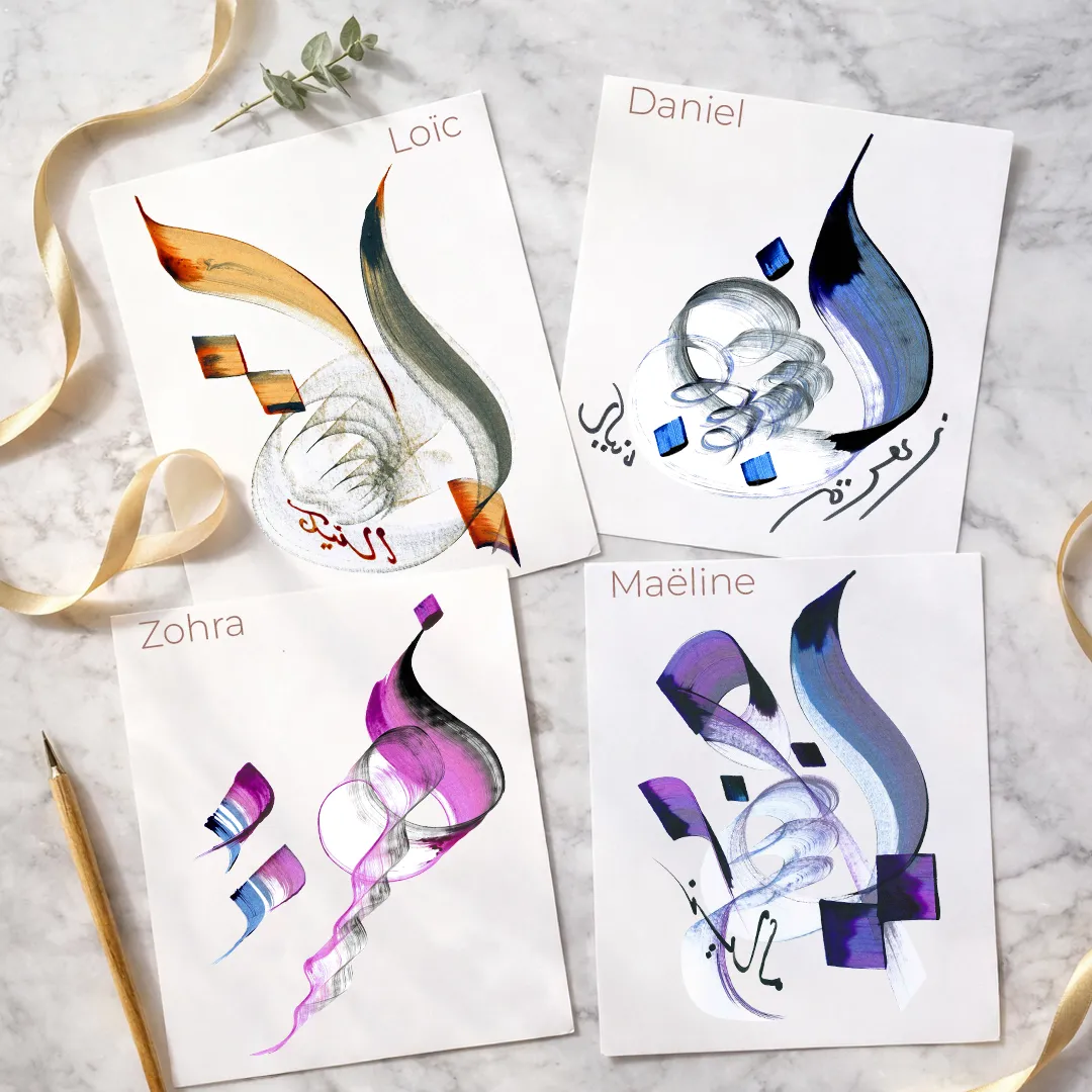 - Pour les prénoms non arabe : Je procède à une adaptation phonétique fidèle pour que la prononciation originale soit conservée une fois calligraphiée en arabe.